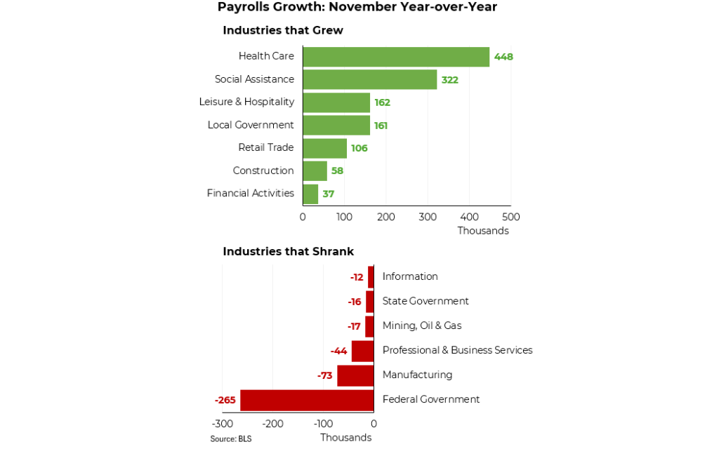 Over the past year, the biggest source of new jobs — by a wide margin — has been healthcare, a total of 448,000 jobs. New social assistance jobs (taking care of the elderly, children, and other people in need) totaled 322,000, followed by leisure & hospitality and local government. On the other end of the spectrum, the biggest job losses came — perhaps not surprisingly — from the federal government. But manufacturing, a focus of President Trump’s, lost 73,000 jobs.