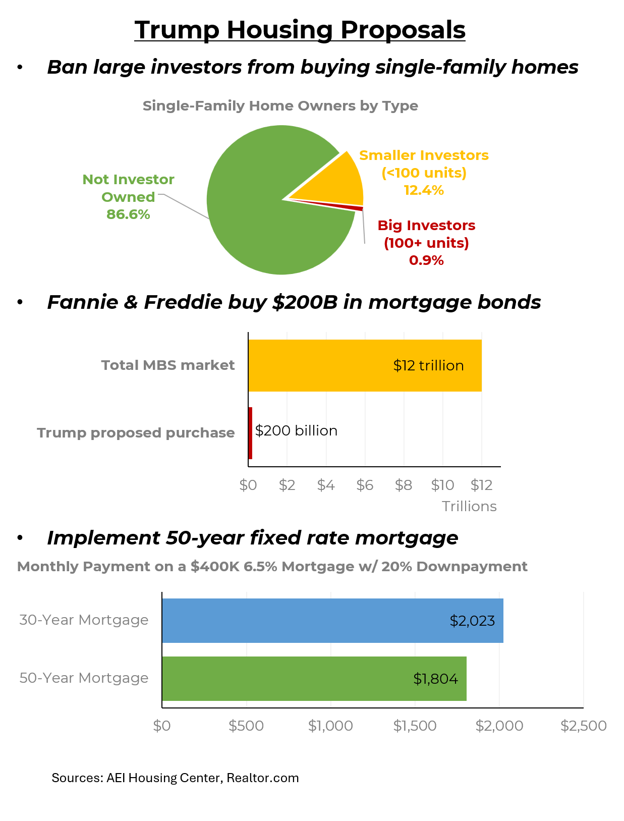 In his speech yesterday and in various other pronouncements, the president has thrown out a few ideas. For example, he suggested banning large investment firms from buying single family homes. But fewer than 1% of homes are owned by those firms. He ordered Fannie Mae and Freddie Mac, the two large government-backed mortgage companies, to buy $200 billion of mortgage bonds to lower interest rates. But that is a small fraction of the estimated $12 trillion market. He seems to have thrown out the idea of creating a 50 year mortgage to lower monthly payments but that would save – at most — $200 a month on a $400,000 mortgage. He has browbeaten the Federal Reserve to lower interest rates, but the Fed doesn’t control longer term interest rates like those on mortgages.