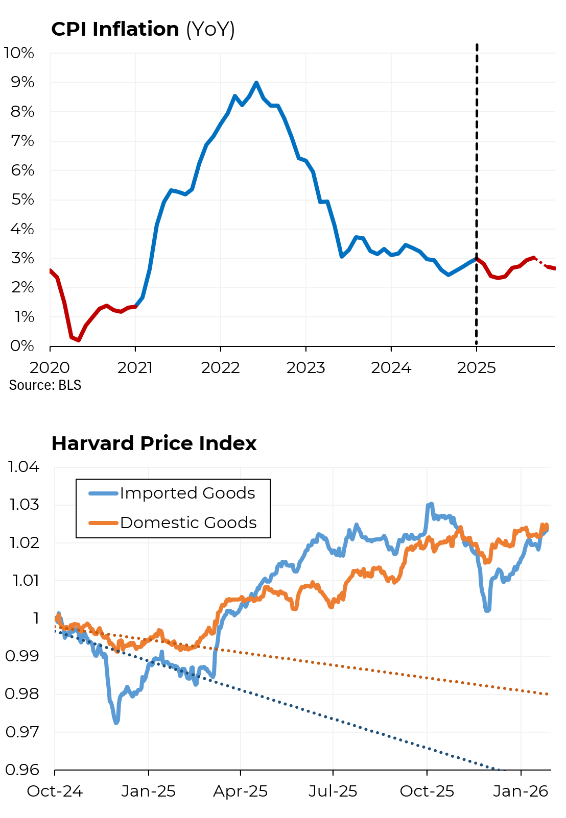 Moreover, Trump’s tariffs policies may well have made inflation worse, not better. Before the tariffs were imposed, the retail prices of both domestic and, particularly, imported goods were trending downwards. After Trump started his trade war, both sets of prices abruptly reversed direction and began to climb. Why did the prices of not only imported goods but also domestic goods start to go up? Because as prices of imported items rose, domestic manufacturers and retailers were able to raise prices on comparable items produced in the United States. All told, imported prices are now 4.5% above where they would have been had they stayed on trend and domestic prices are 7.1% above trend.