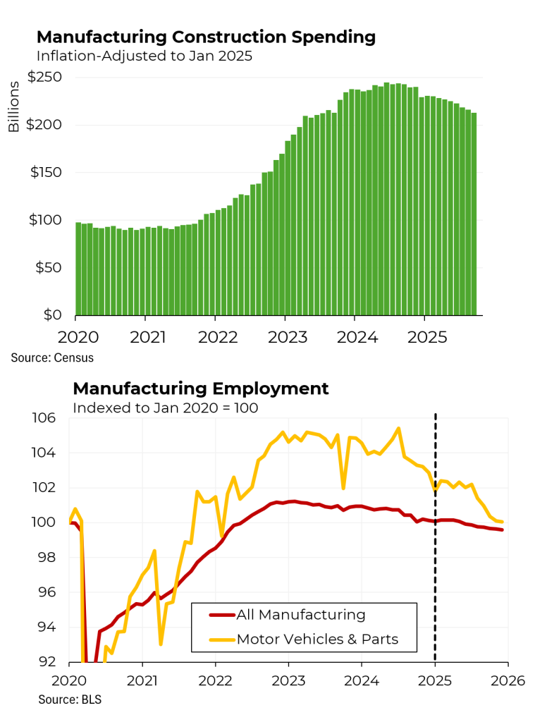 Well, no, they are not being built “right now.” Spending (after adjustment for inflation) on manufacturing facilities, which peaked in the middle of 2024, has yet to show any sign of increase. In fact, the boom in construction of manufacturing facilities can be attributed to the policies in effect during the administration of President Joe Biden, particularly the passage of the CHIPS and Science Act, which stimulated the building of semiconductor facilities. In contrast, spending in this area has declined almost every month since Trump took office.
