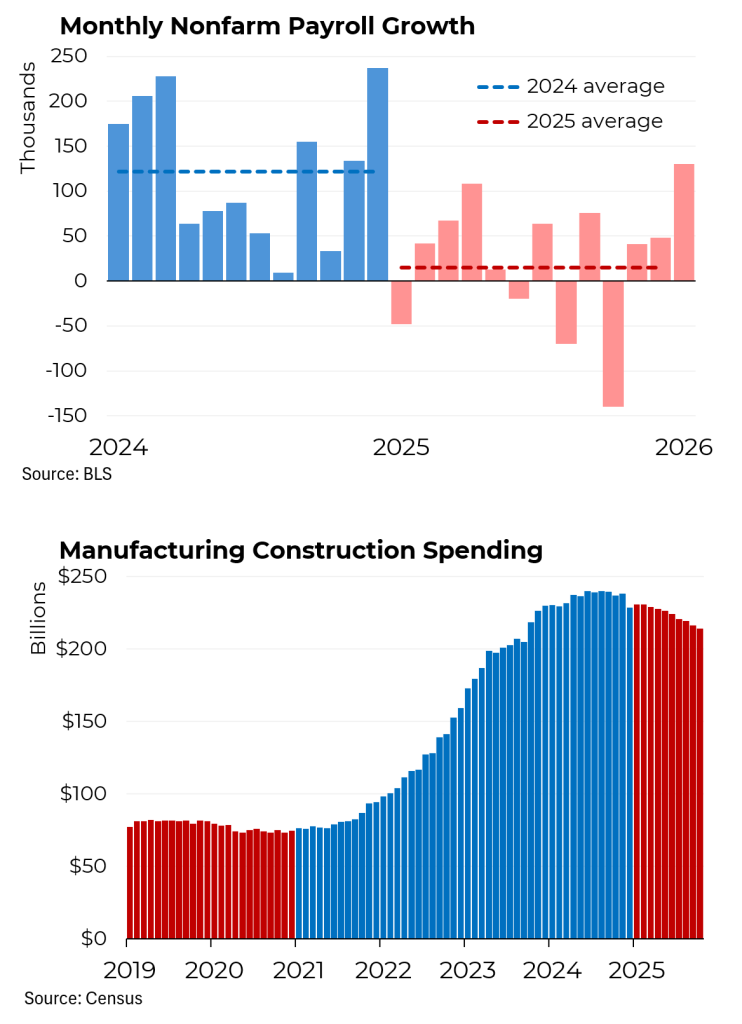 Nor are factories “pouring into the United States of America.” Spending on manufacturing construction declined steadily during 2025 as Trump imposed tariffs (which increase uncertainty around input costs) and moved to halt Biden-era investment programs, like the poorly-named Inflation Reduction Act.