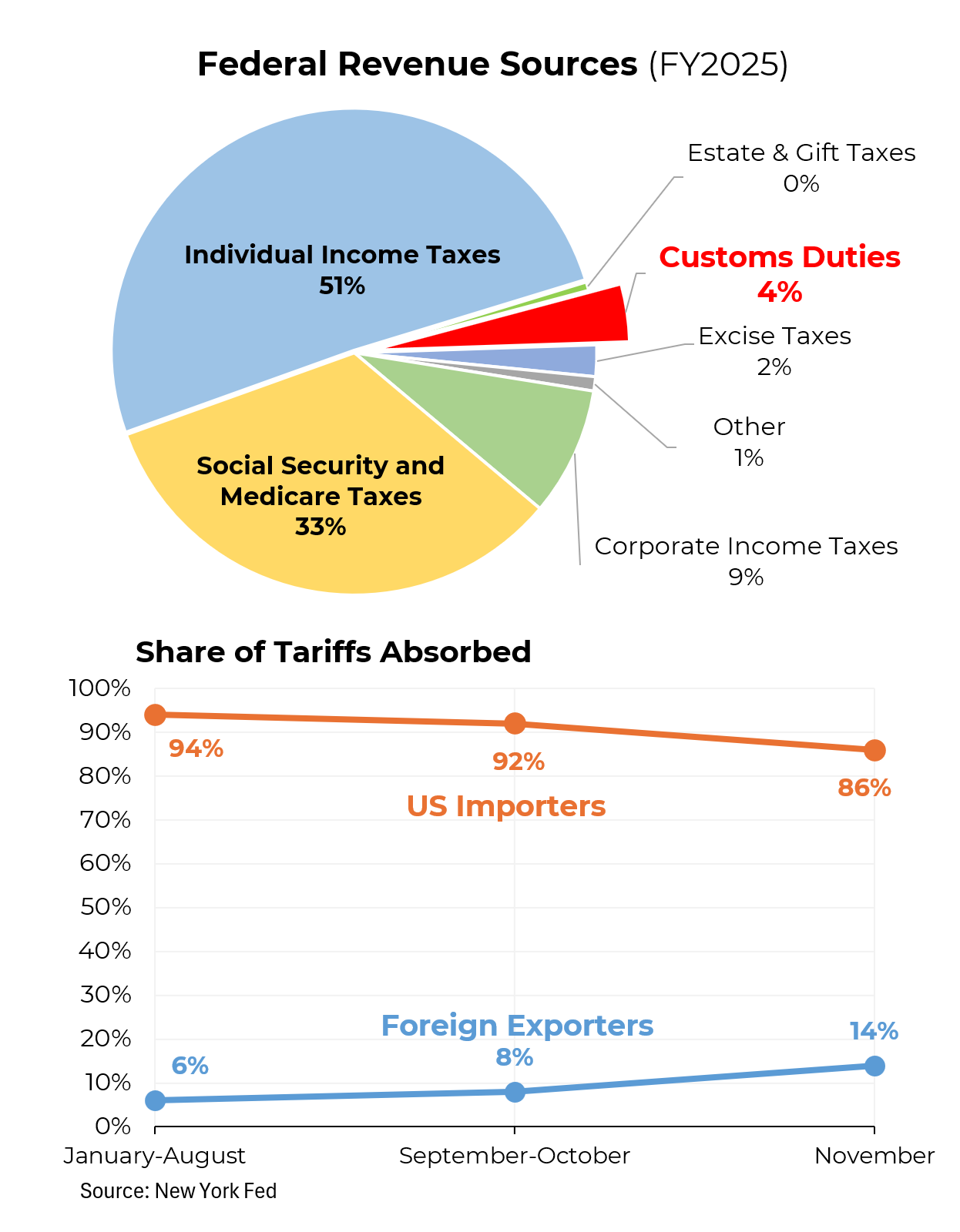 The idea that tariffs could “substantially replace” – or anything like it – the income tax is laughable. Washington collects about $2.7 trillion a year in personal income taxes. By comparison, last year all of Trump’s tariffs amounted to $264 billion of revenue. Indeed, the total amount of U.S. imports is not much more than the amount of income tax that is collected. (And now, of course, even the current level of tariff revenues is in doubt.)