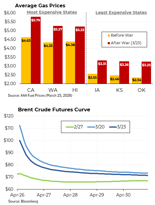 What’s almost as concerning is that the market is not expecting prices to return to pre-war levels anytime soon. While Trump’s Monday announcement caused a significant drop in current crude oil prices (to $100 per barrel from $112 per barrel on Friday), it still expects the price of a barrel to be around $78 a year from now, compared to its expectation of less than $68 before the war began. (Every dollar per barrel is 2.5 cents per gallon.)